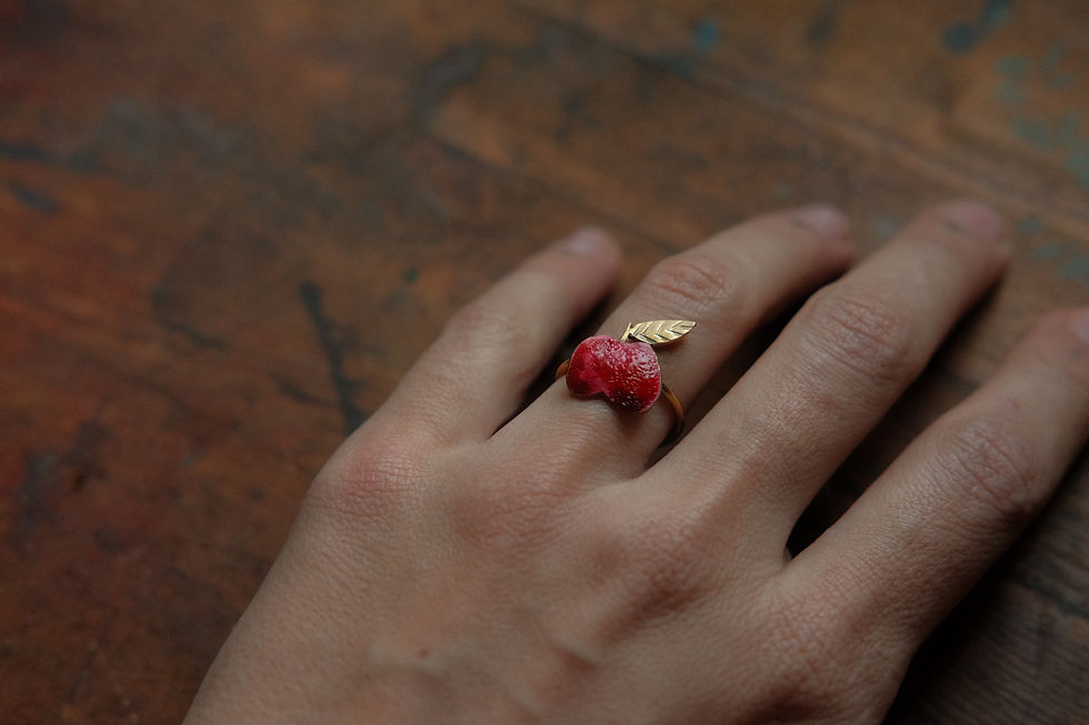 What nourishes us is born from the earth. It feeds us, teaches us care and reminds us that we are part of a major cycle. That is why my collection of Cosecha jewels is a tribute to the Pachamama, in the Andean worldview, the Pachamama is not only the fertile soil that gives us food, but a living being that breathes, feels and who is honoured with offerings. Each jewel is a reminder of our relationship with nature, that what sustains us is not bought or produced in series, but is born from the earth. The first jewel in this collection was born during my son's gestation. In the middle of the pandemic we lived in Formentera, in the La Mola area, one of the most distant places on the island. Our little house-workshop was on the edge of a cliff where there were almost no neighbours and the immensity of the sea embraced us every day.The isolation, which in other places was lived with confinement, for us was open air, home garden and daily walks. Between the global uncertainty and the distance of the family, Caetano grew in my belly and we learned to live in a different way: slower, more attentive to the small. At the door of the house there was a small and old fig tree, which gave delicious brevas, of an almost black purple colour. That fig was the first seed of this collection of jewellery inspired by fruits and vegetables. The fig is a fruit full of mystery. For me it was also a refuge in uncertain days: the unexpected sweetness offered by a tree that barely survives between the stones. Thus was born the first fig earring, hand-painted on metal, large, striking, as a declaration of abundance in times of scarcity. It was the first collection where I began to experiment with pigments and develop the technique I use today. A friend gave me some incredible colours that she had brought from India and, after five years, I still have a little. My figs continue to be born from those pigments, as if each jewel carried a pinch of a distant journey. It's funny how you can have affection for a colour, but I'm sure that the day it's over I'll feel that a cycle closes: figs will continue to be born, but with other tones, like life itself. Then came more pieces, as if the collection grew along with my son. He devoured artichokes with pleasure, and I translated those vegetable forms into textured metal and intense colours. Artichokes transformed into fun earrings, which today, when I take to the markets, generate smiles and complicity. OSn pieces that arouse conversation, that break the ice with humour. In our walks around the island also appeared the vineyards loaded with grapes, the bright pomegranates and the ancient olive trees that resist the wind. All that entered my workshop and turned into a jewel. Grapes, turned into necklaces and earrings, are a song to the celebration. From Greek mythology they are associated with Dionysius and wine, shared enjoyment, the full table. A grape jewel is a party bunch to wear on the body, an amulet for wine lovers and toasts that are repeated over and over again. The pomegranate always fascinated me. To open it is to discover a world of red seeds, like little hidden rubies. In ancient times it was a symbol of life and fertility, and also of the mystery of Persephone in the underworld. As a jewel, the grenade becomes a reminder of the multiple, of what beats in secret and opens suddenly with force. The olive tree, on the other hand, is Mediterranean root. Tree of peace, longevity and wisdom, whose branches have been accompanied by crowns, rituals and pacts. Transformed into bracelets and earrings, it becomes a gesture of calm and rooting, a reminder that we are always linked to the earth and time. Among my childhood memories are lemons and tangerines. Lemons, with their acidic freshness, always seemed to me rays of sun turned into fruit. Tangerines take me to the bright winters, to the juice in the hands, to the simple snacks at school, where peeling a tangerine and sharing the wedges is almost a ritual of friendship. Like jewels, both fruits shine with vibrant colours, large pieces that convey vitality and everyday joy. The pears, on the other hand, connect me with my aunt, who prepared them in the oven with red wine. That warm dish is now a ring or an earring that keeps the memory of the shared kitchen, of the family tenderness. In the artistic tradition, the pear has been a symbol of the feminine, of sweetness and abundance. Transformed into a jewel, it is a piece that speaks of intimacy and care. Our watermelons were born as a solidarity jewel, to raise funds for a cause that we believe is fair. It was our way of accompanying the Palestinian people from art, joining so many voices that resist from different trenches. The watermelon, with its red, green and black colours, became a symbol of support and hope. I never thought that such a summery fruit could become a political emblem, but so it was: solidarity watermelons travelled in the bodies of those who decided to use them as a gesture of resistance. Garlic could not be missing, that popular amulet against evils and envy, ancestral protector. In peasant markets, in rural homes, garlic was always present not only in the kitchen, but hung as a symbolic Defence. In my collection, garlic is transformed into a jewel loaded with strength, a small handmade talisman that recalls the wisdom of everyday life. And under the earth, like a secret, the beet appears, with its intense colour that stains hands and memories. It represents the underground, what is not seen with the naked eye. A beetroot jewel is root and mystery, the hidden that is suddenly revealed with power. In all these pieces there is a constant play with the size. I like to design large and striking jewellery, where the metal becomes canvas and receives shape, texture and colour. I paint each piece with enamels, acrylics or watercolours, looking for the intensity of the colour to give life to the jewel, as if it still kept the juice of the fruit or the sap of